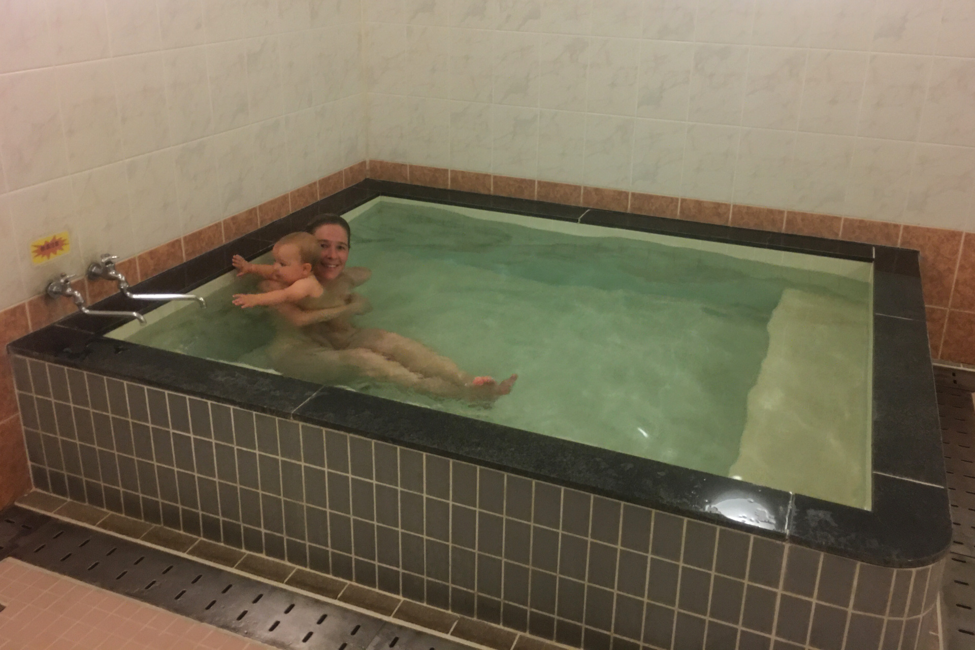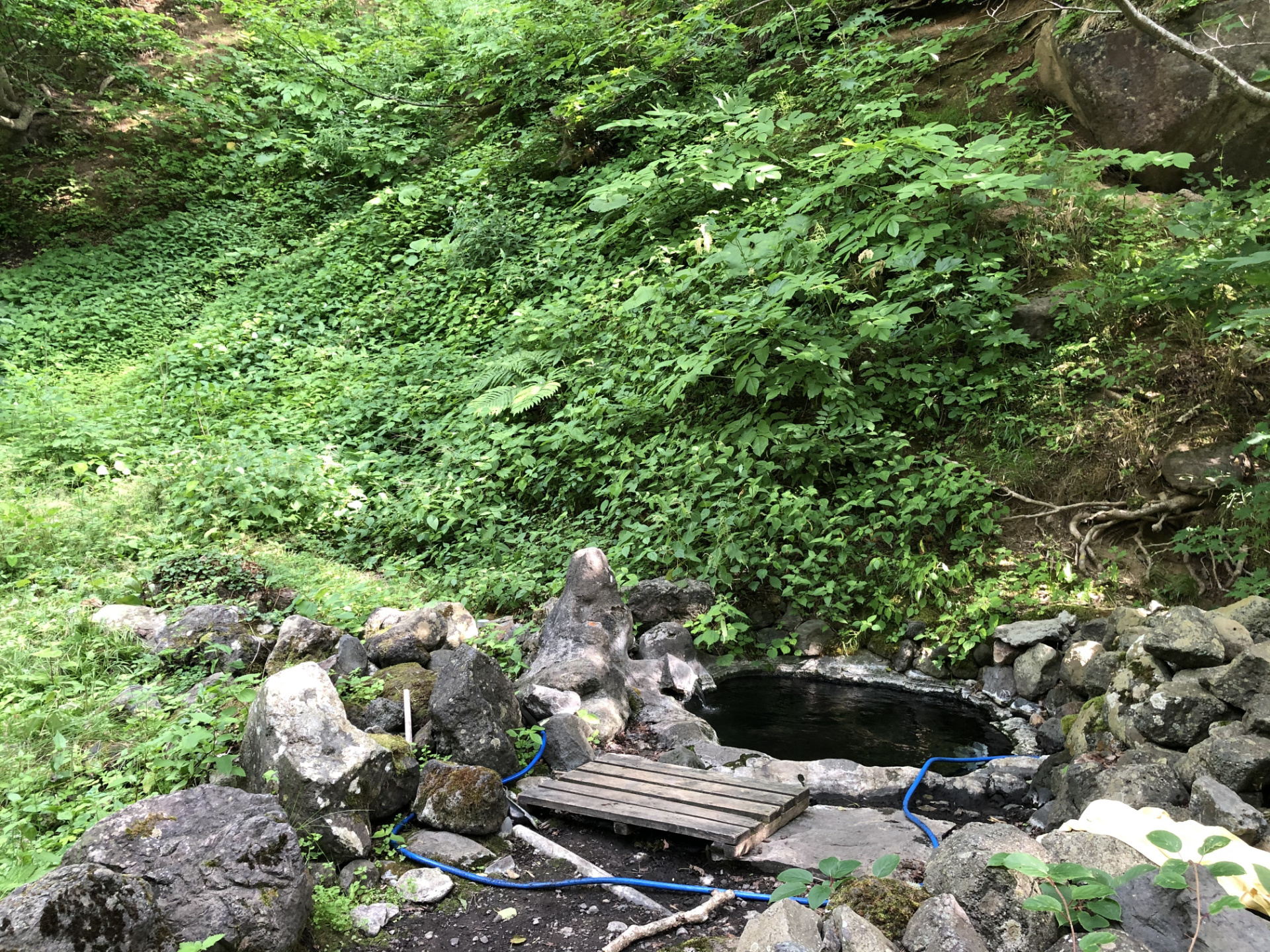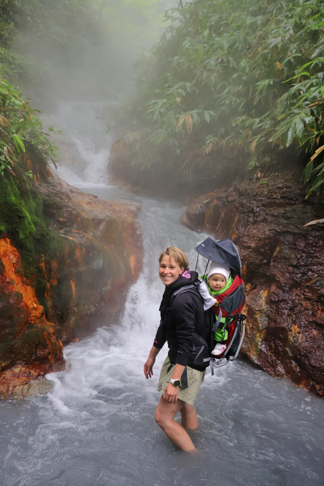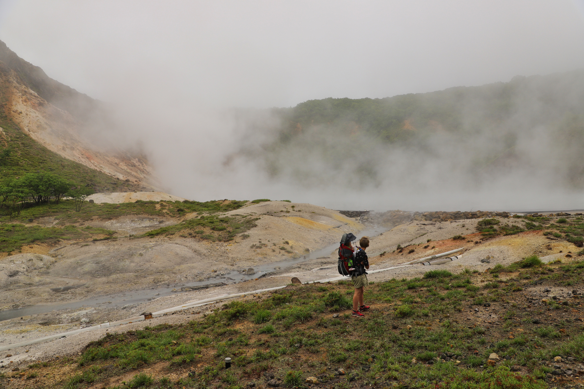 Auch ist das Wasser nur lauwarm, so dass es sich nicht zum aufwärmen eignet. Wir machen uns also ein wenig enttäuscht auf den Rückweg und nehmen diesmal auch den einfacheren schnellen Weg zum Parkplatz, so dass wir nach 30min das Auto erreichen und uns als erstes im Fahrzeug umziehen und aufwärmen. Wie das Wetter so spielt scheint auch alsbald die Sonne wieder – nach einer ordentlichen Teigtaschen-Mittagsstärkung und trockenen Klamotten/Schuhen wagen wir nochmals den Weg (wir dachten, dass wir im Regen und Nebel doch etwas übersehen haben müssen). Aber wir haben nichts übersehen – bei klarerem Himmel finden wir auch schnell eine Badestelle (zwar hübsch, aber immer noch „nur“ lauwarm), verzichten also auch weiterhin auf ein Bad und erforschen eher die Heißwasserquelle und die dazugehörigen „Bebauungen“, mit denen das heiße Wasser ins nächste Dorf geleitet wird.