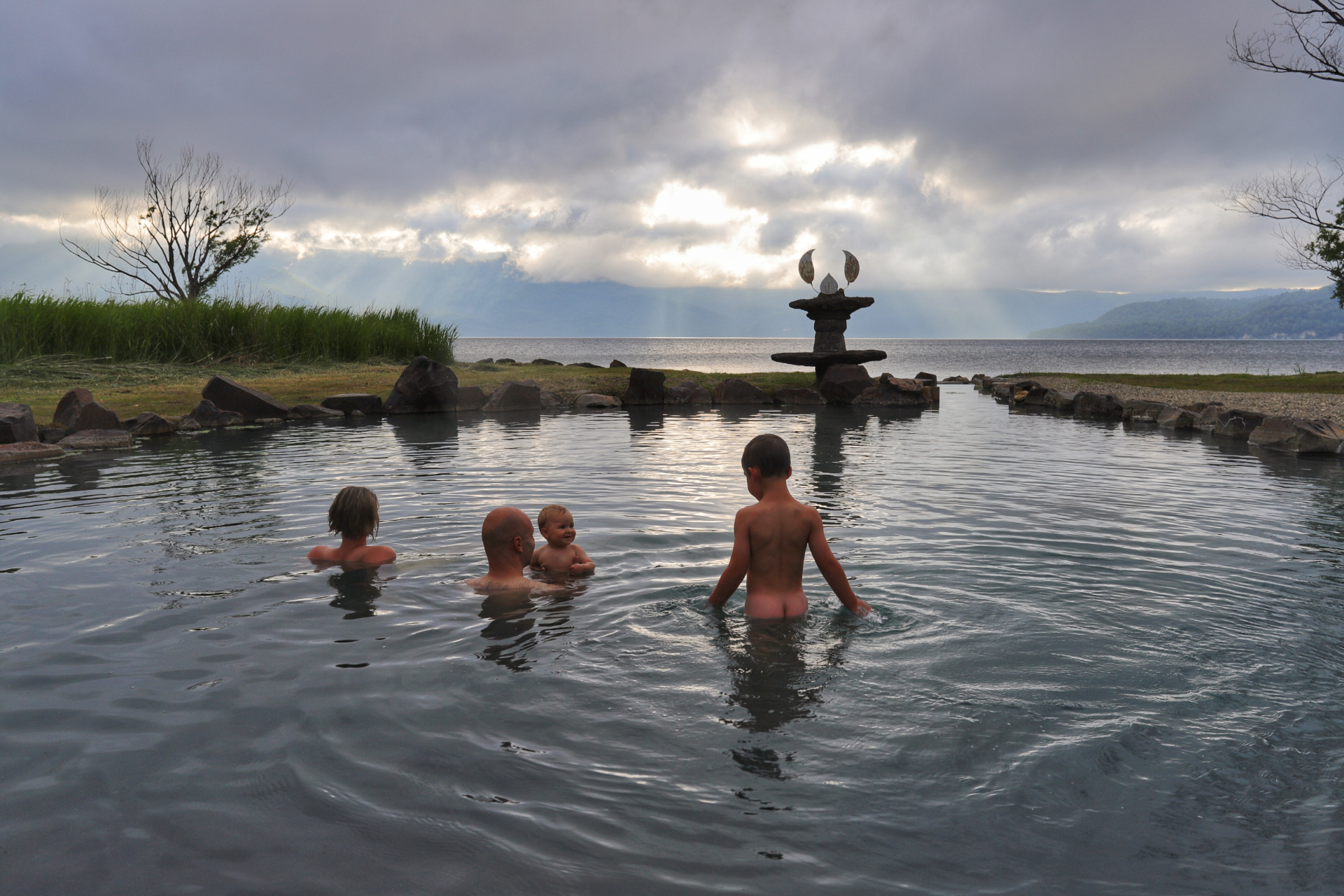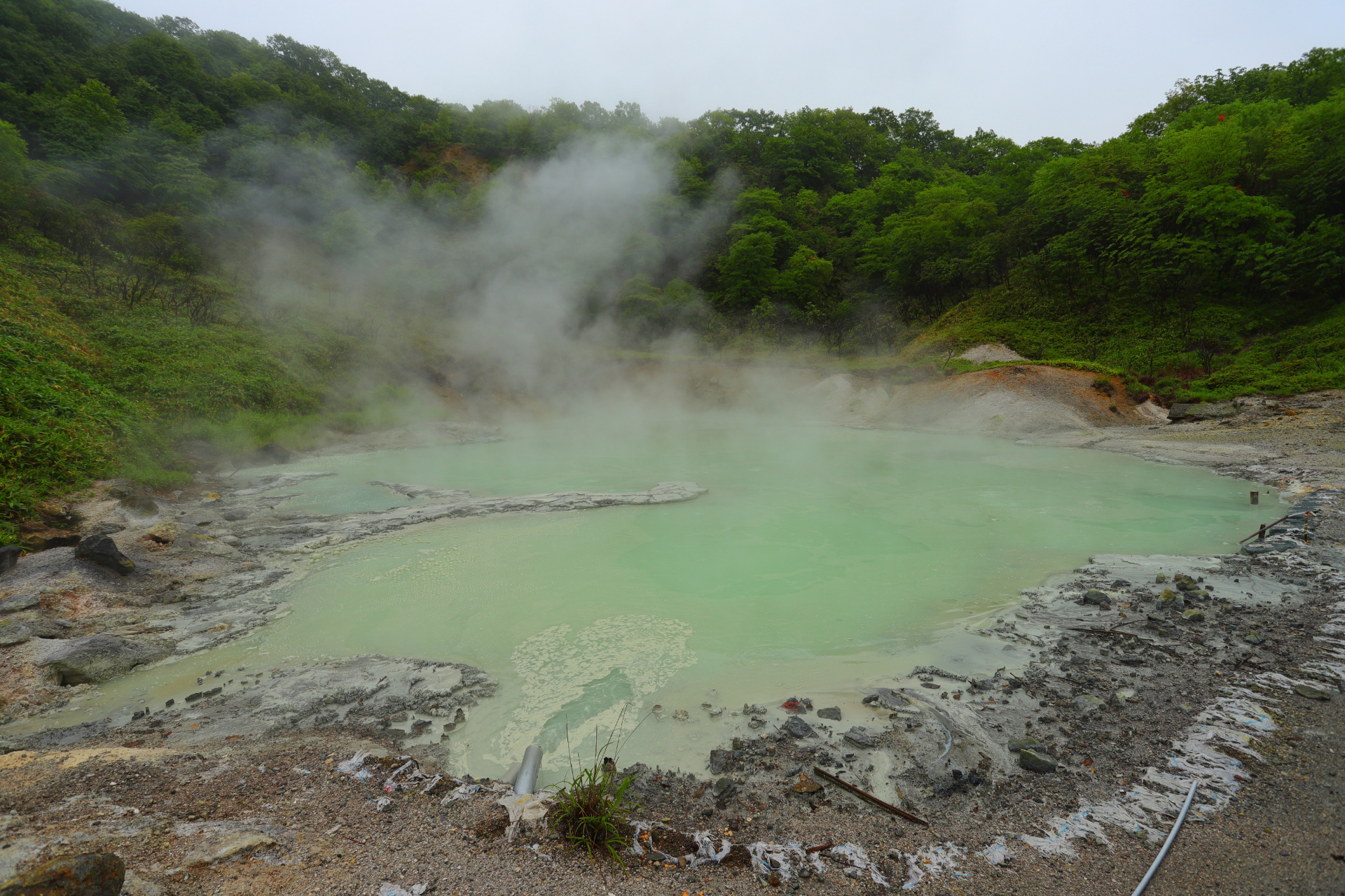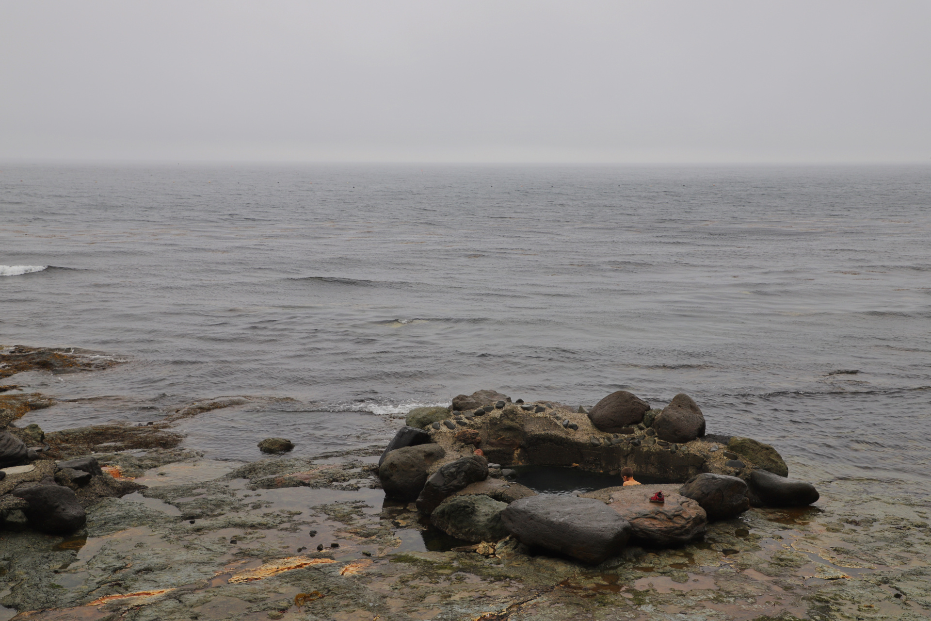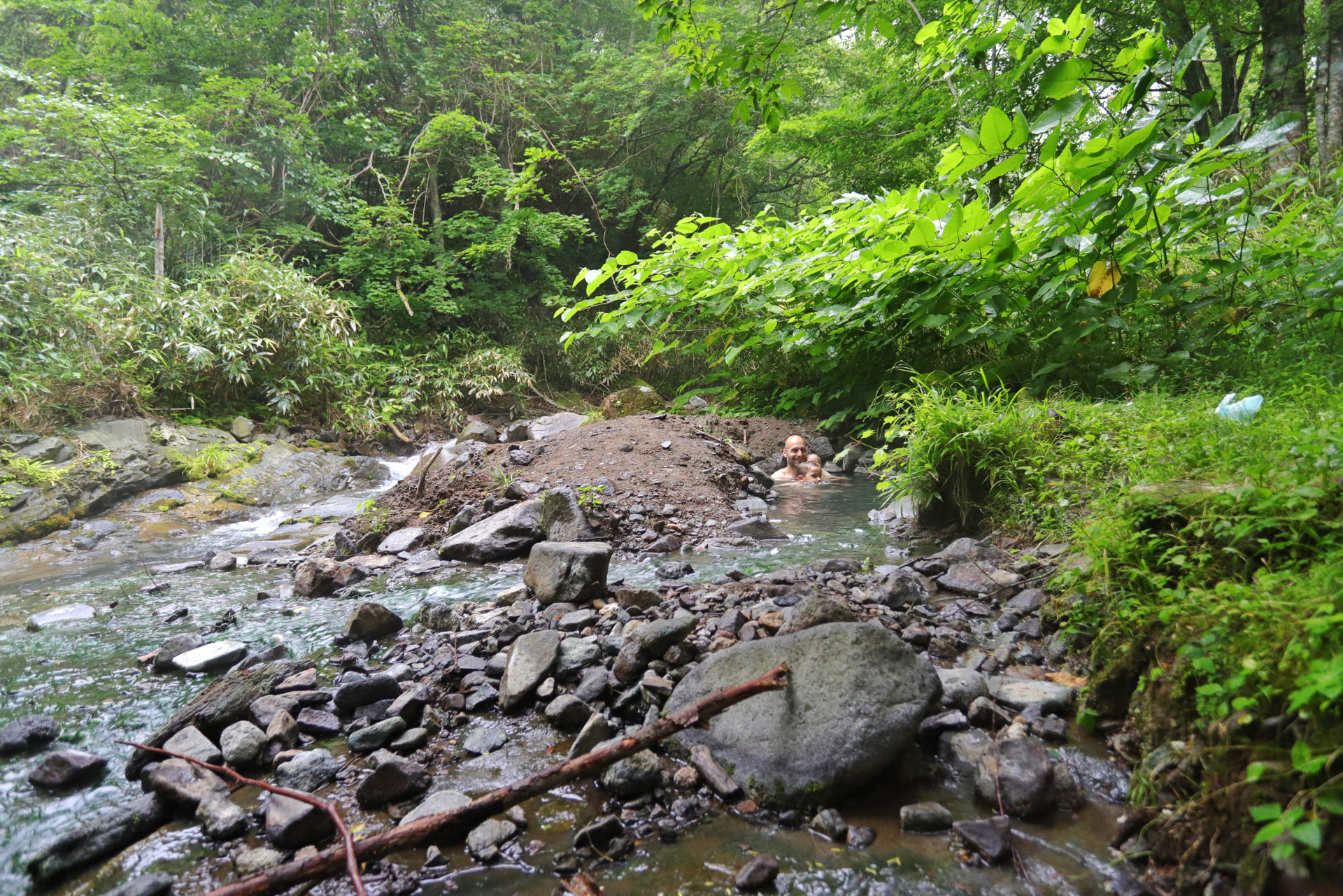 Eine weitere kleine Vulkanwanderung bei starkem Wind führt uns um einen kleinen Krater herum, bevor wir uns ein paar Kilometer weiter auf die Suche nach dem nächsten „Rotemburo“ machen (so werden die „Onsen“, heißen Quellen in der Natur eigentlich genannt). Leider macht uns hier das Wetter einen Strich durch die Rechnung. Nach ca 10 min Weg fängt es an zu regnen – oder besser formuliert: es schüttet und schüttet, so dass wir zwar klatschnass an einem warmen Flüsschen ankommen, aber ziemlich durchfroren sind.