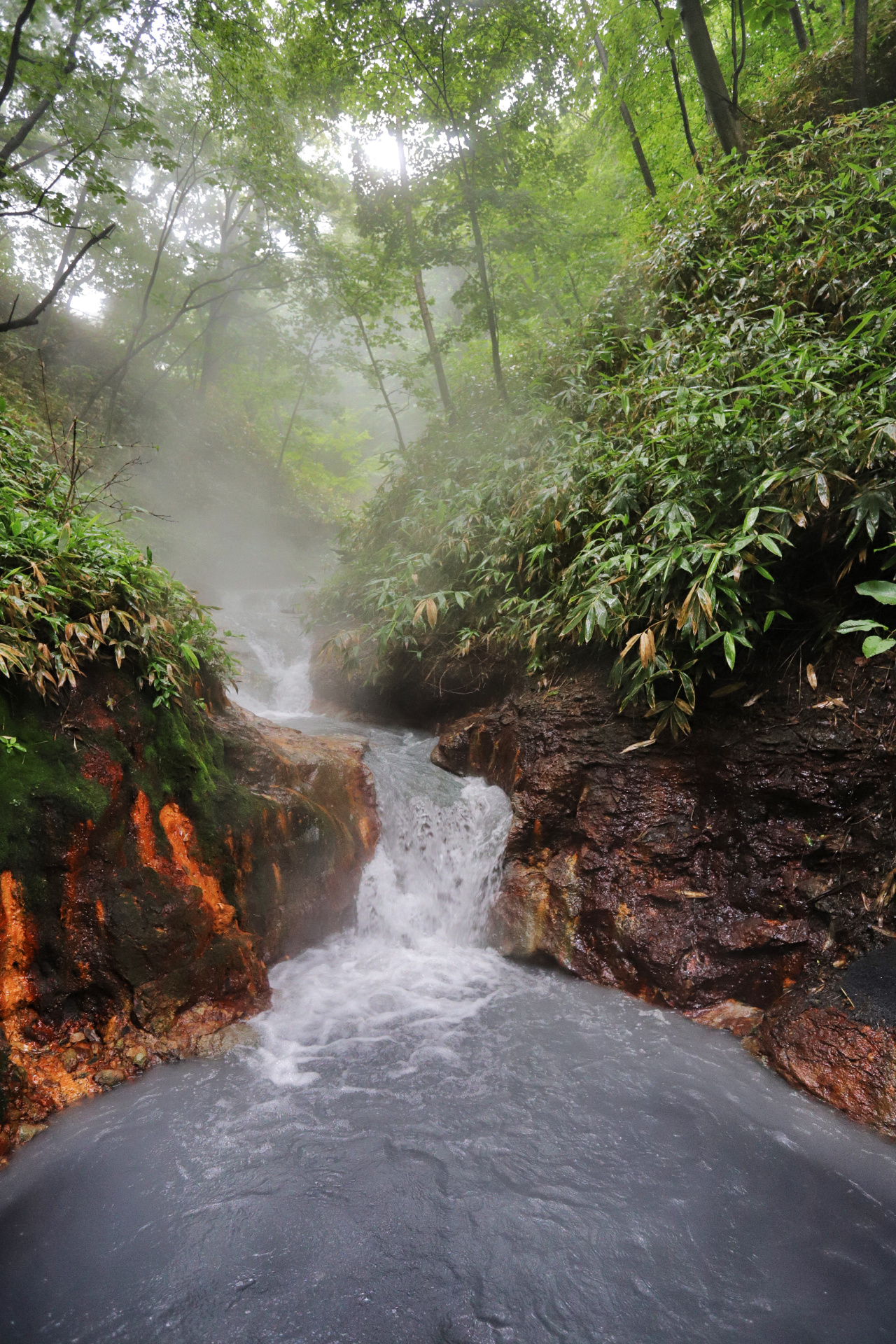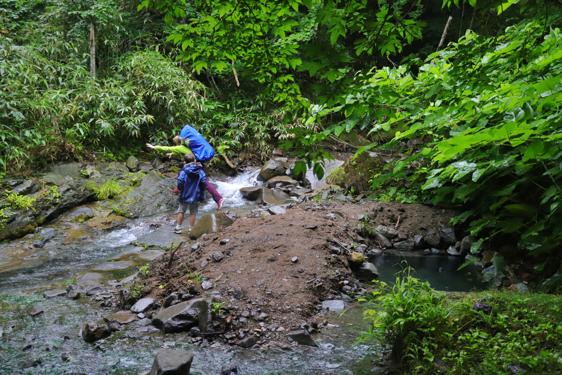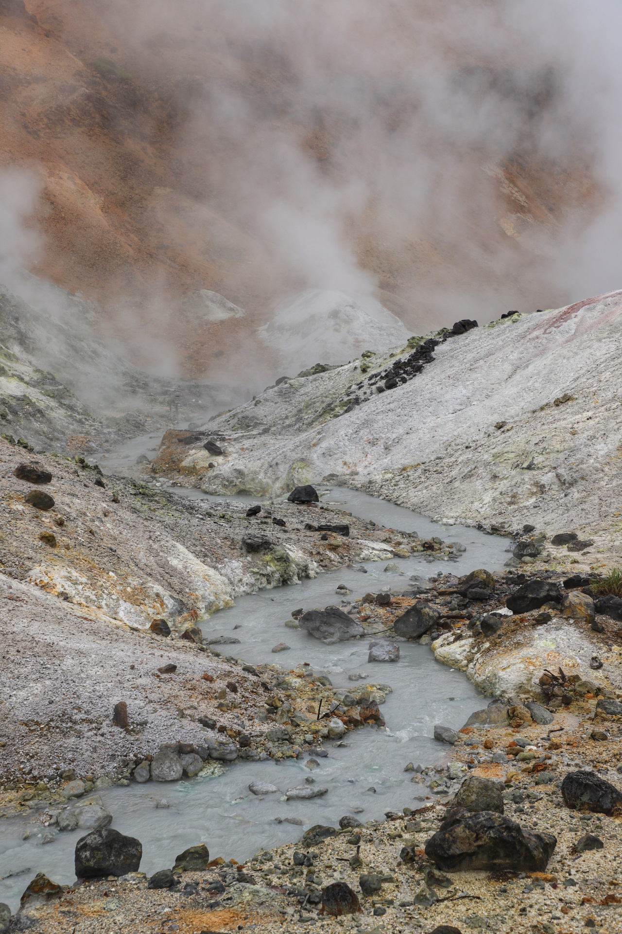Eine weitere kleine Vulkanwanderung bei starkem Wind führt uns um einen kleinen Krater herum, bevor wir uns ein paar Kilometer weiter auf die Suche nach dem nächsten „Rotemburo“ machen (so werden die „Onsen“, heißen Quellen in der Natur eigentlich genannt). Leider macht uns hier das Wetter einen Strich durch die Rechnung. Nach ca 10 min Weg fängt es an zu regnen – oder besser formuliert: es schüttet und schüttet, so dass wir zwar klatschnass an einem warmen Flüsschen ankommen, aber ziemlich durchfroren sind.