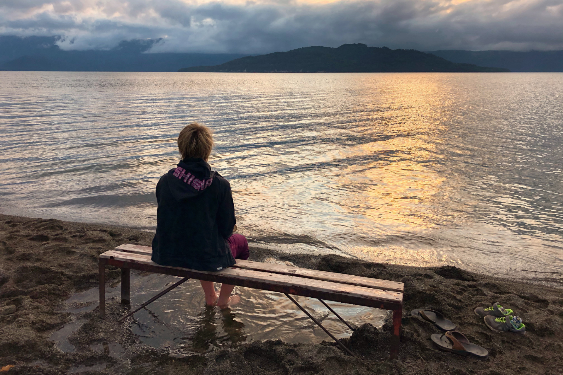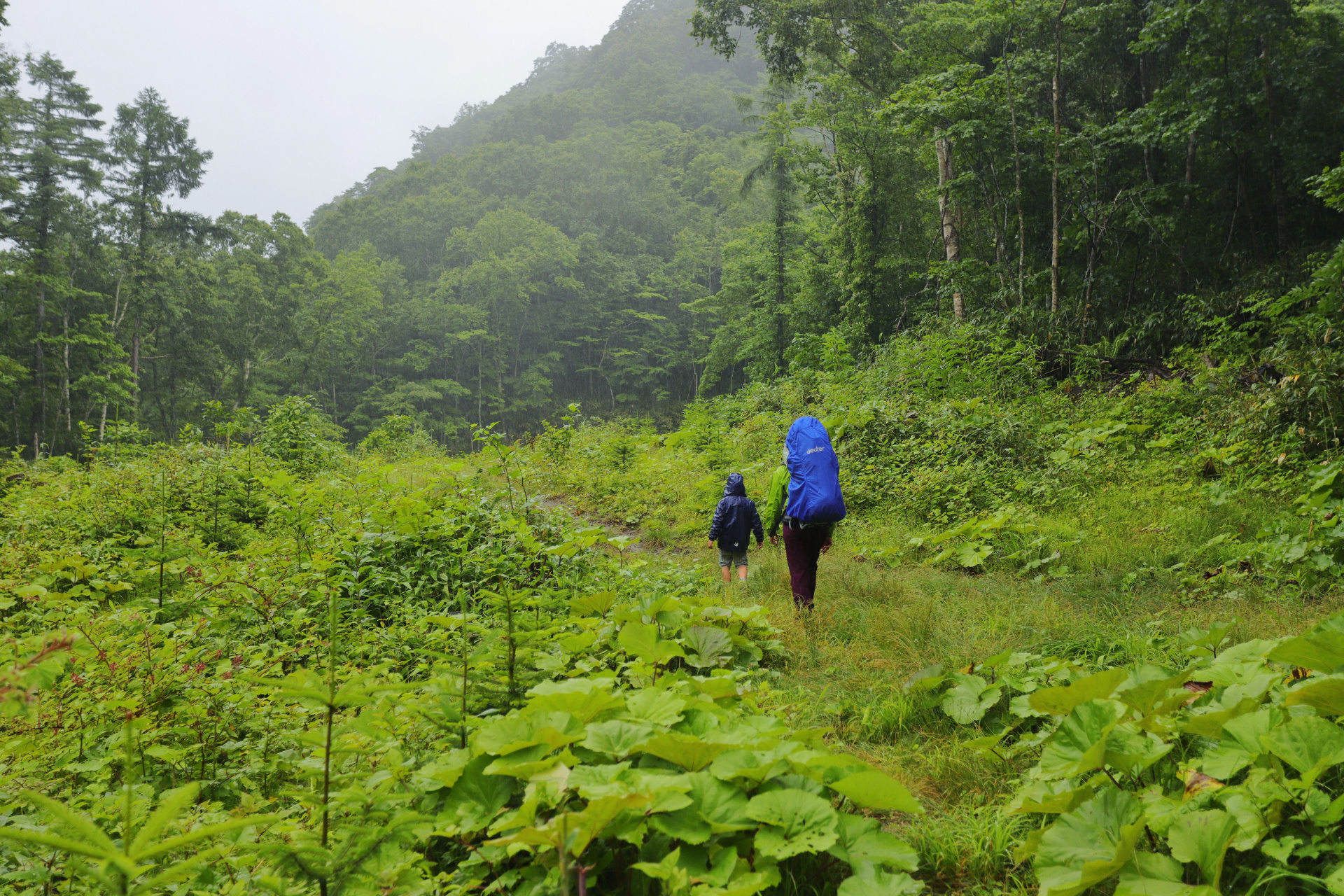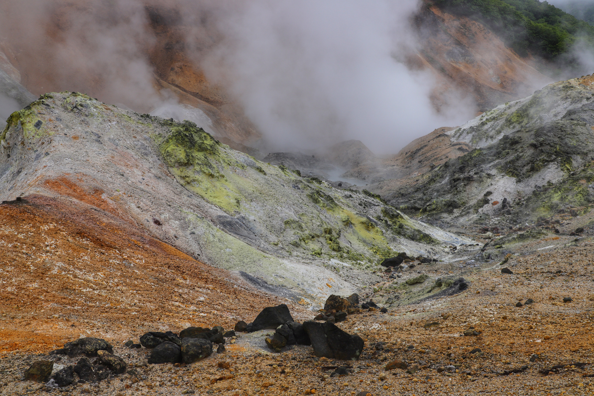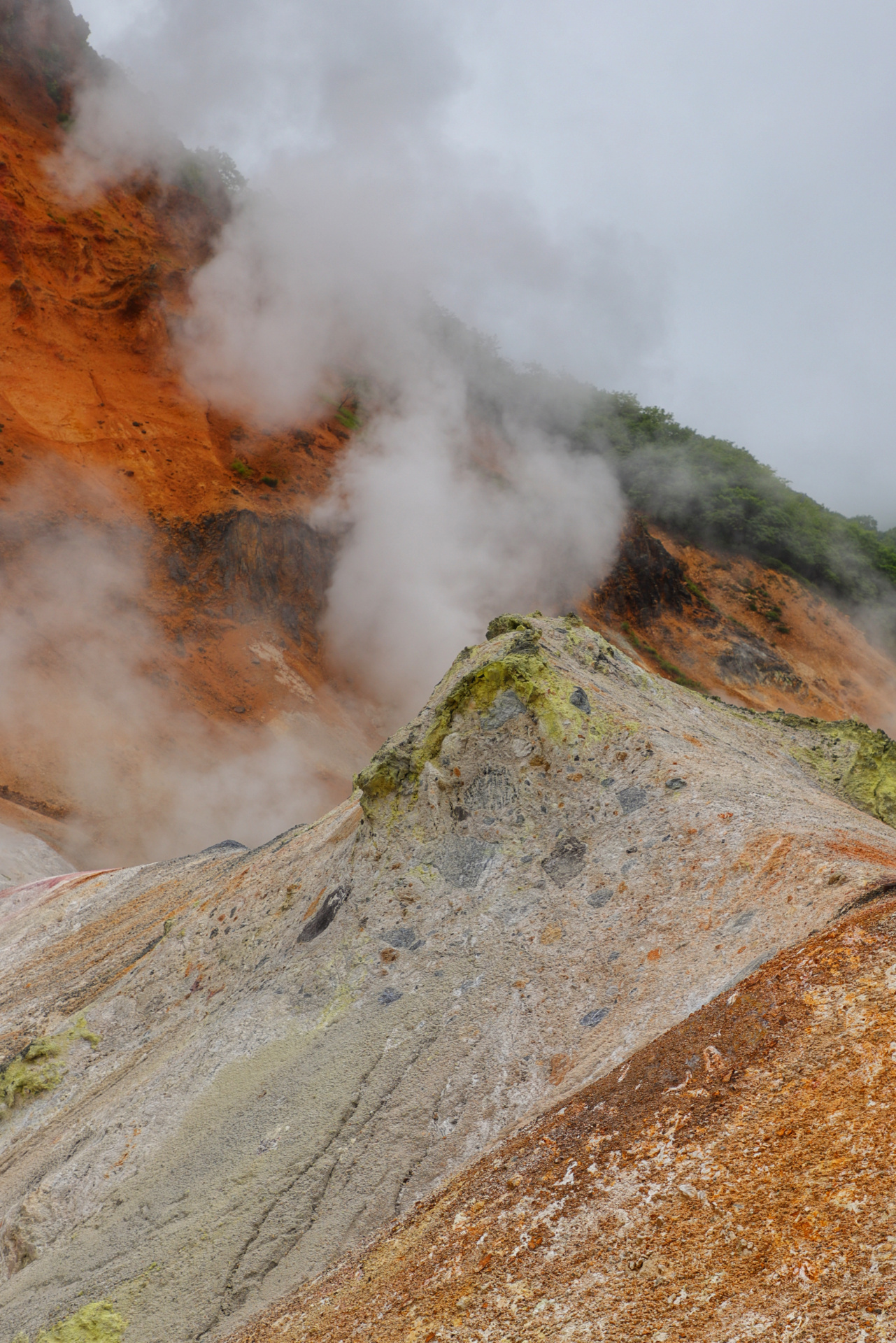 Eine weitere kleine Vulkanwanderung bei starkem Wind führt uns um einen kleinen Krater herum, bevor wir uns ein paar Kilometer weiter auf die Suche nach dem nächsten „Rotemburo“ machen (so werden die „Onsen“, heißen Quellen in der Natur eigentlich genannt). Leider macht uns hier das Wetter einen Strich durch die Rechnung. Nach ca 10 min Weg fängt es an zu regnen – oder besser formuliert: es schüttet und schüttet, so dass wir zwar klatschnass an einem warmen Flüsschen ankommen, aber ziemlich durchfroren sind.