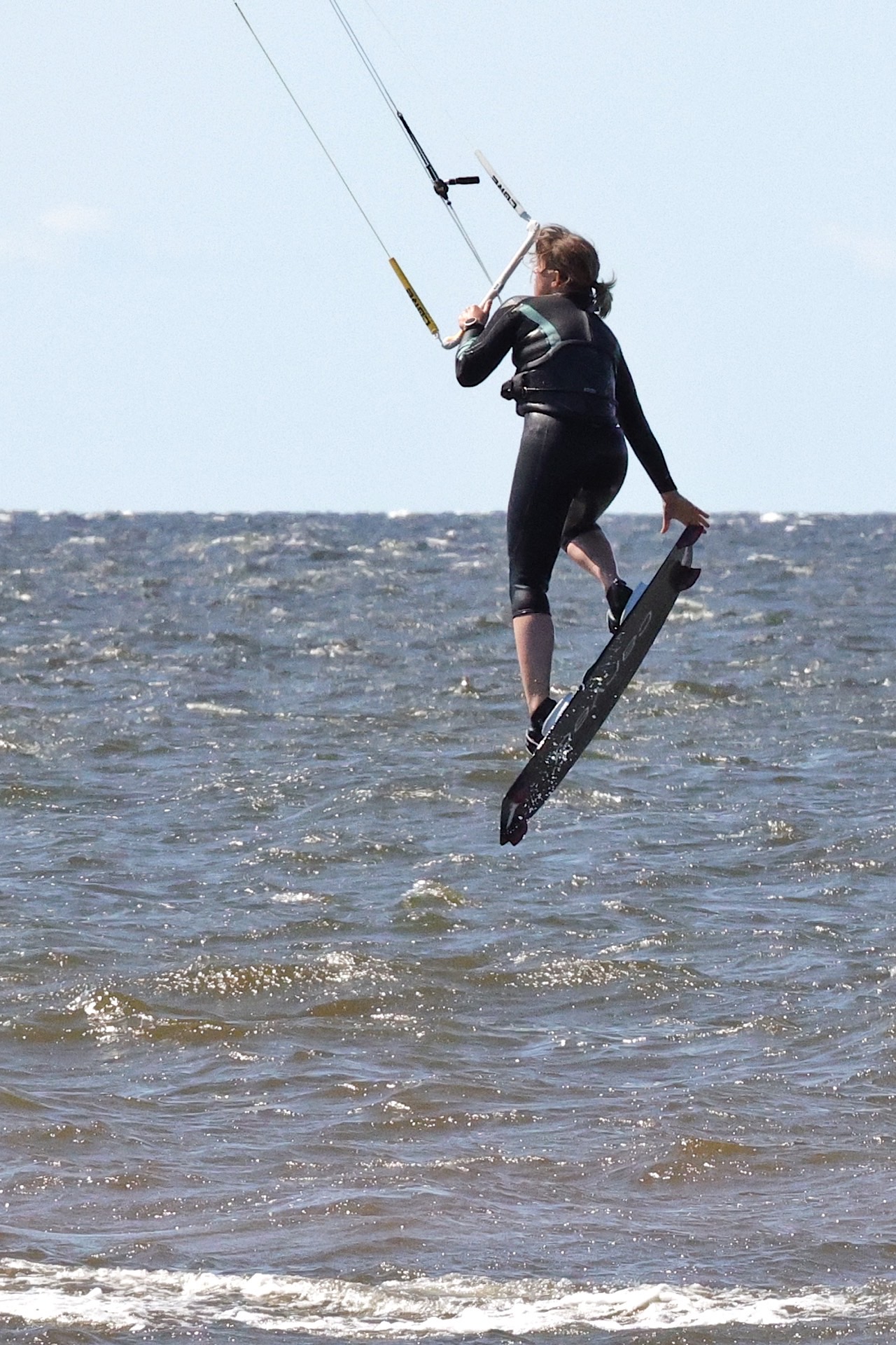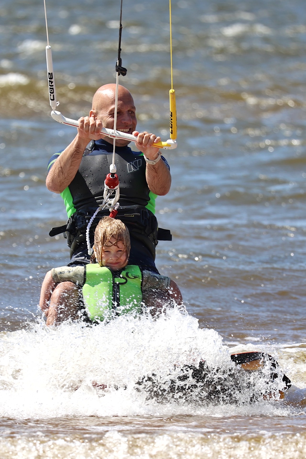 Am Sonntag war auch gleich Wind. Wir fuhren eine Ecke weiter und standen direkt am Kitespot. Das Wasser war so schön weit raus noch flach, dass Lasse auch gleich wieder zum Üben kam.