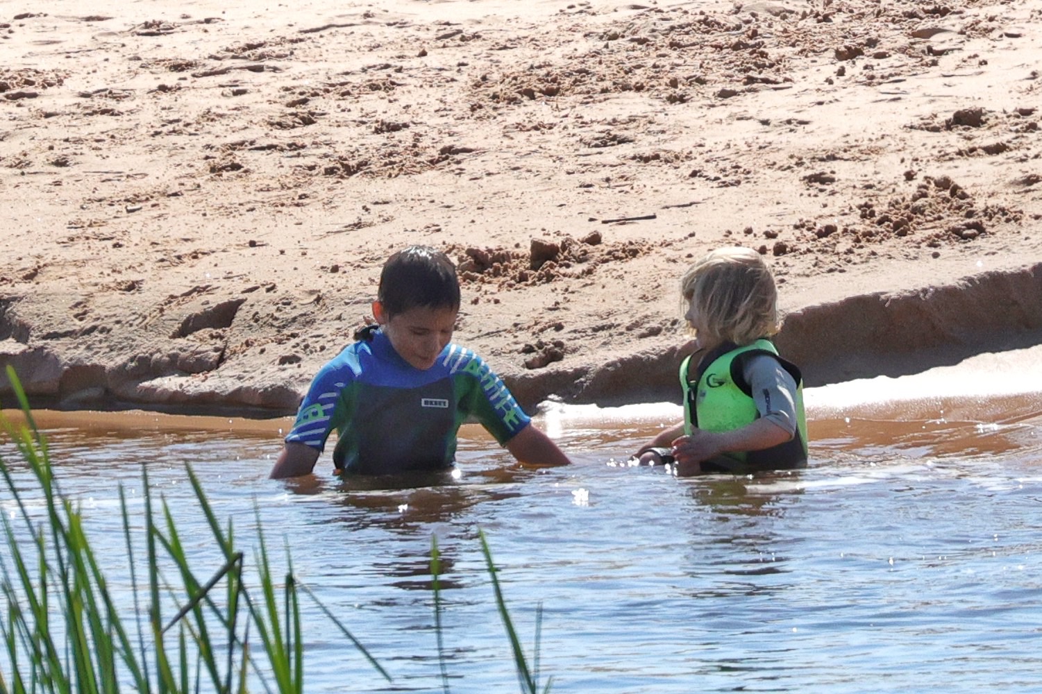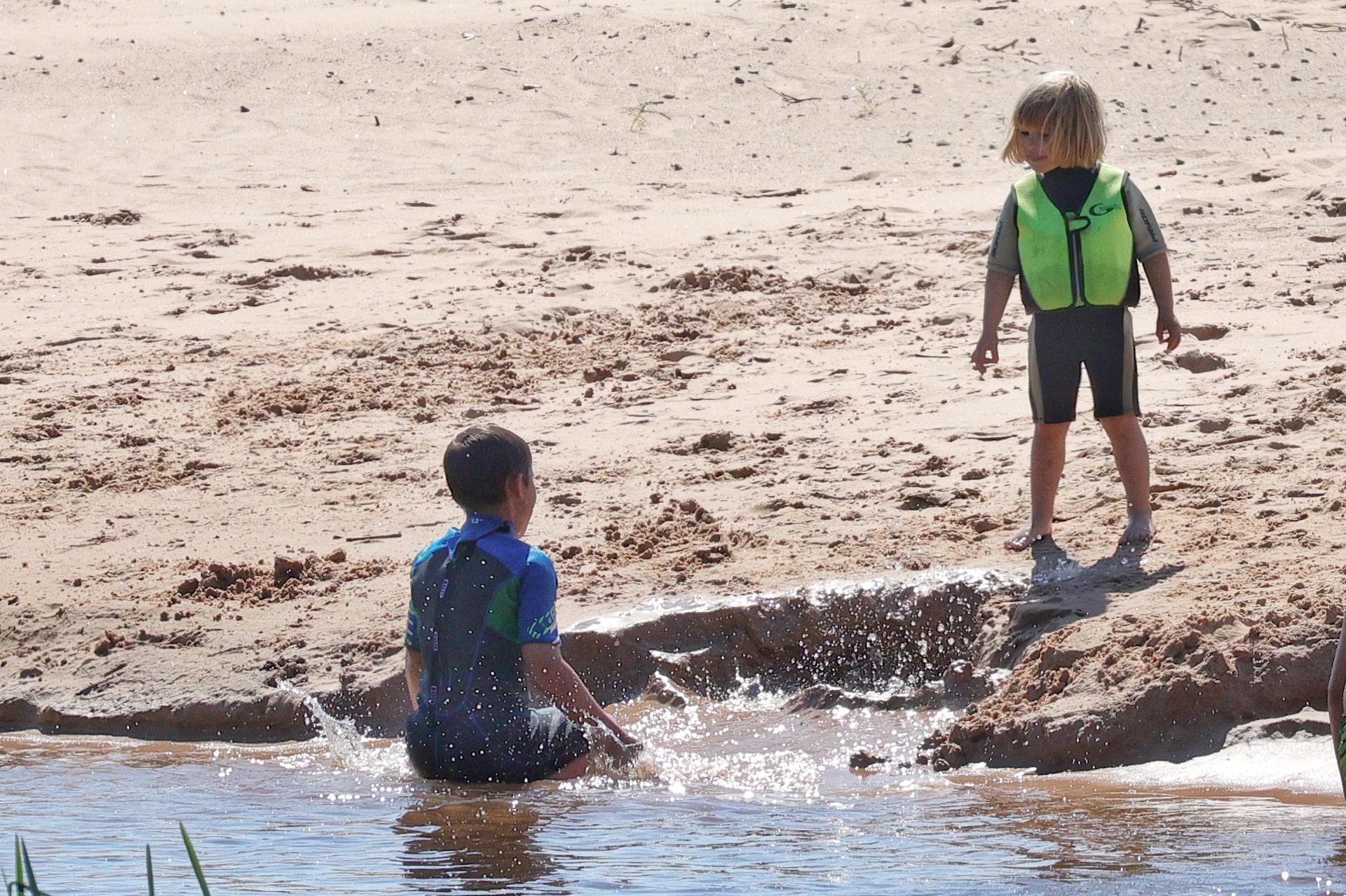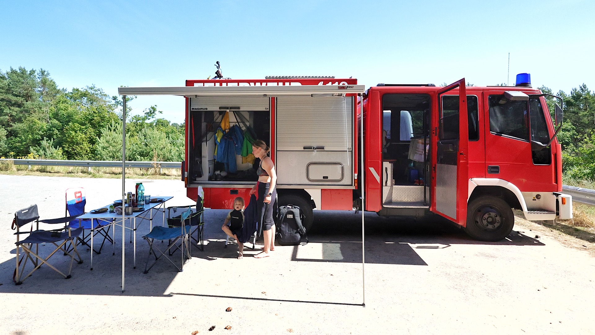 Weiter ging es am nächsten Tag wieder mit viel Wind vorhergesagt. Wir hatten uns überlegt, auf der Nehrung nördlich von Köslin zu bleiben. Dort hatten wir ein schönes schattiges Plätzchen hinter den Dünen gefunden. Nachdem wir allerdings fast den gesamten Nachmittag mit Spielen im Sand verbracht hatten und dem Boden nicht mehr über den Weg trauten, fuhren wir doch noch ein Stückchen weiter bis zu einem tollen Platz an einem kleinen Badesee. Hier schmissen wir den Grill an und erfrischten uns zur Abwechslung im Süßwasser.