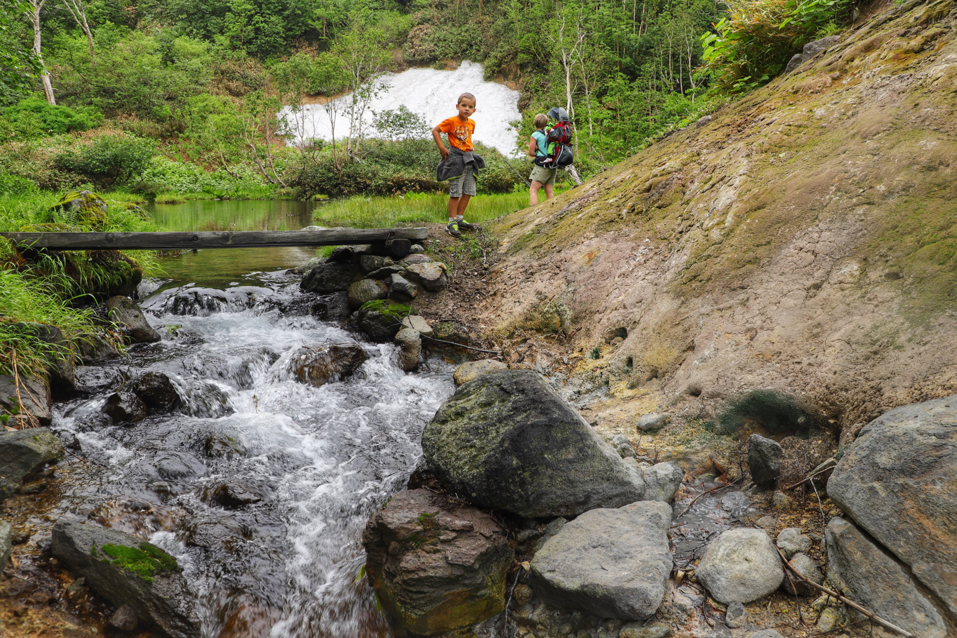 Jetzt hatten wir müde Füße und machten uns auf die Suche nach einem schönen Onsen. Leider ergab unsere Suche nur ein lauwarmes Fußbad, immerhin an einem hübschen Plätzchen im Wald, wo wir Staudämme bauen konnten.