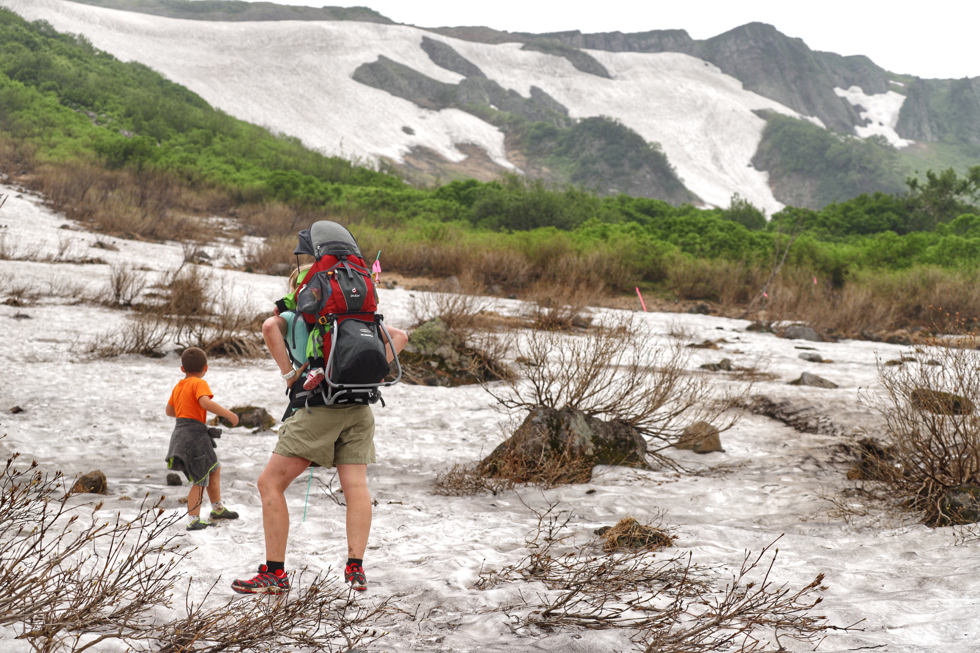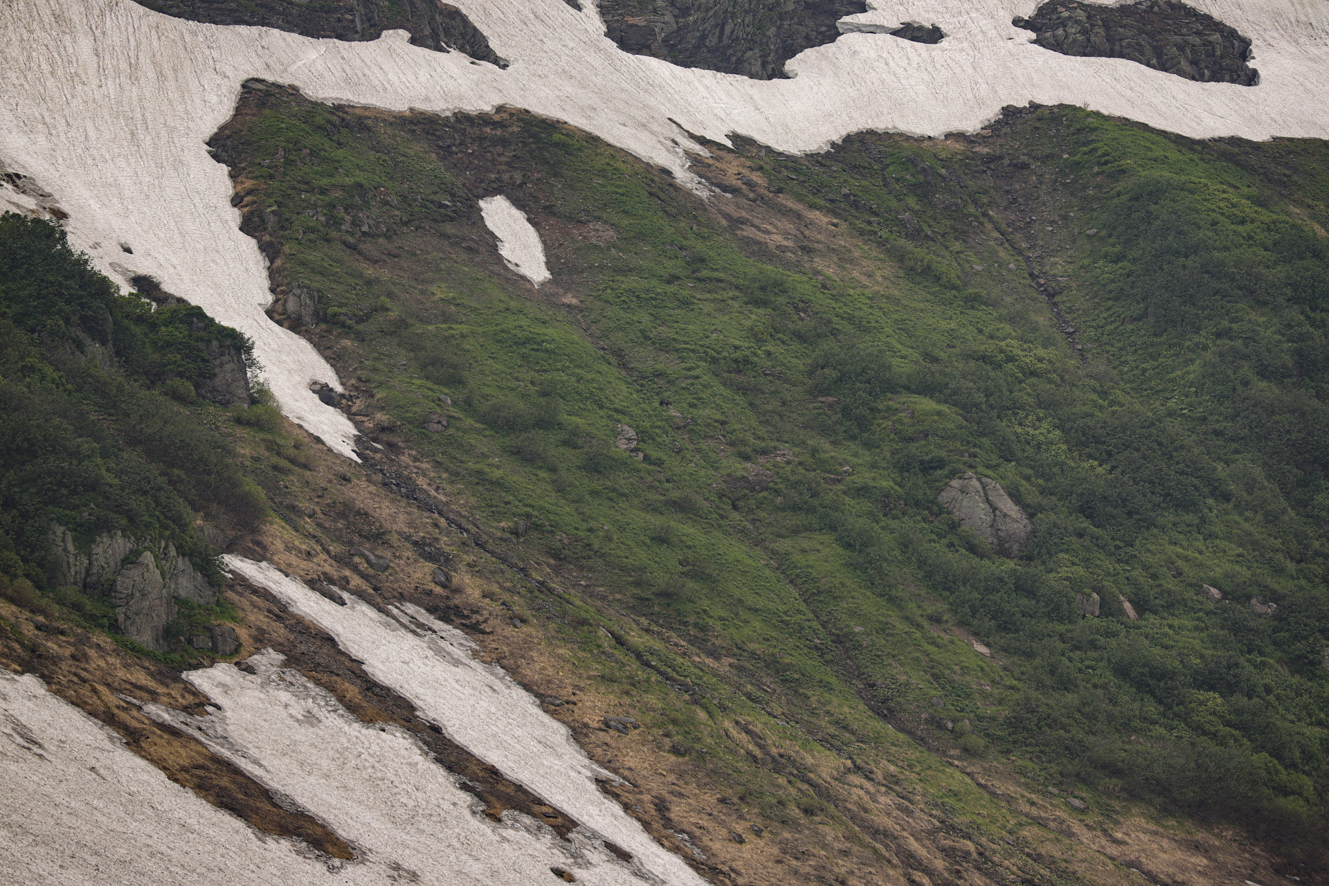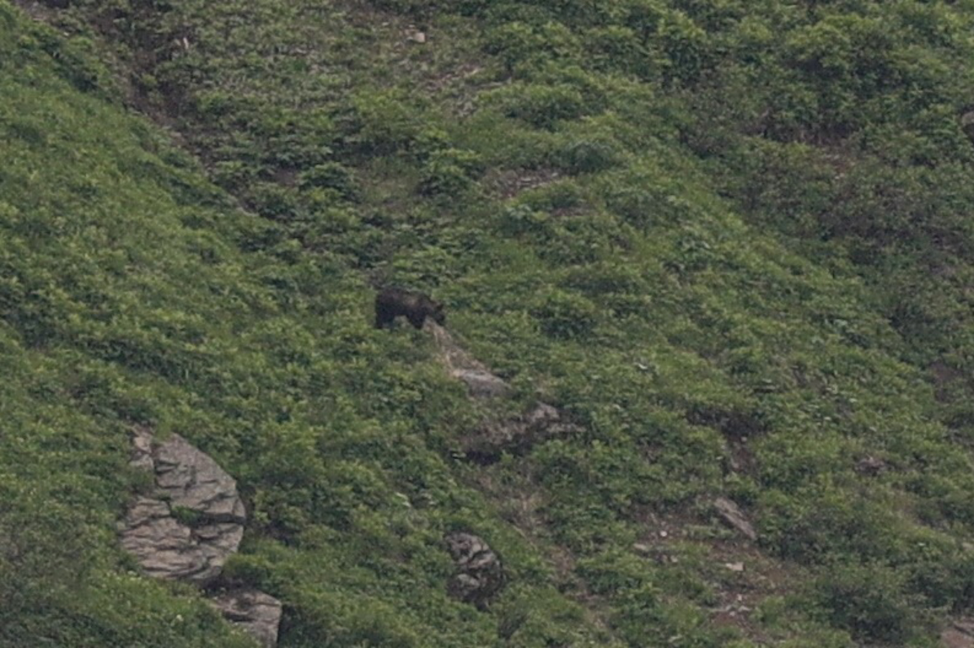 Die Wanderung führt über 2h lang durch den Wald, bevor man alpines Gelände betritt und weiter blicken kann. Auch das eine oder andere Schneefeld wartete dort auch uns und war ziemlich rutschig. Am Ende waren bereits zwei japanische „Bärensucher“ mit starken Fernrohren vor uns auf Beobachtungsposten. Und tatsächlich entdeckte einer einen großen Bären, der über die Hänge strich. So groß er auch war, er war so weit entfernt, dass man ihn fast nicht erkennen geschweige denn fotografieren konnte. In der Galerie ist eine starke Vergrößerung von dem Foto.